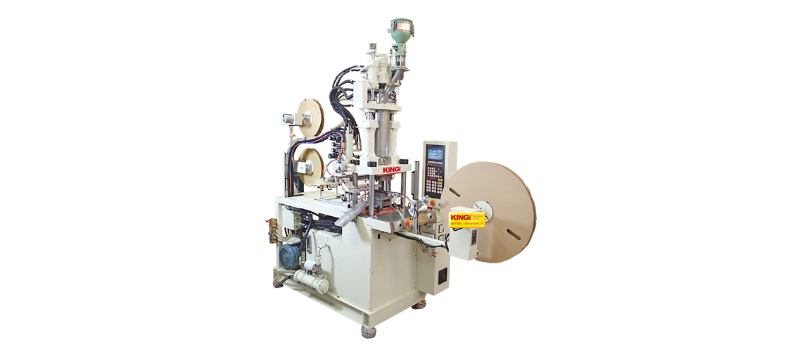 Reel to Reel Injection Molding Machine. Fully automated feeding system. A continuous carrier strip fed from rear reel through the front reel (take-up reel) of the injection molding machine, the plastic is molded over the parts on the strip then feed onto the take-up reel.